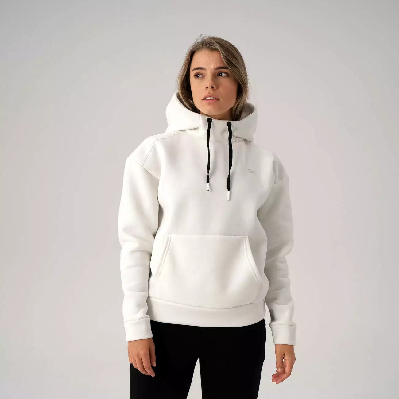 Женский теплый худи свободного кроя с капюшоном со стойкой и карманом-кенгуру.